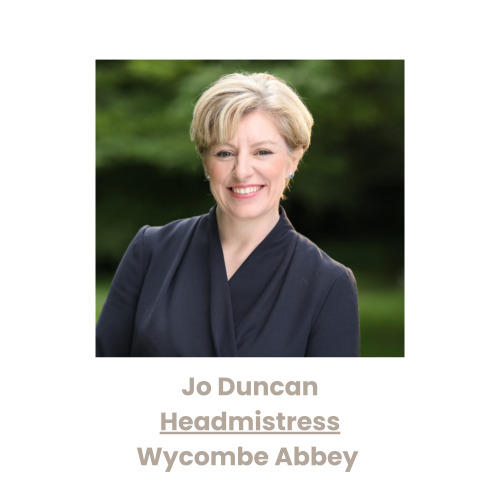 Jo Duncan is a graduate of the University of St Andrews where she read for a joint degree in  English Literature and Theology. She grew up in Northern Ireland and attended a girls’ grammar  school. She undertook her PGCE at Homerton College, University of Cambridge. Her first  teaching post was as a teacher of Religious Studies at The Latymer School in North London – from there, she moved to Benenden School in Kent as Head of Department and Deputy  Housemistress. She has held two previous Headships and was appointed Headmistress of  Wycombe Abbey in September 2019.